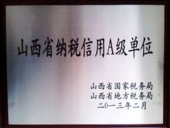 2013年6月14日,我公司榮獲省國稅、地稅聯(lián)合頒發(fā)的“山西省納稅信用A級單位”榮譽(yù)稱(chēng)號。
